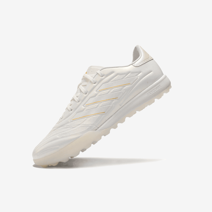 Der adidas Copa Pure 2 League TF in Weiß mit goldenen Details vereint das klassische Copa-Design mit innovativer Technologie. Entwickelt für Spiele auf Kunstrasen, bietet er weichen Tragekomfort, präzisen Ballkontakt und zuverlässige Stabilität.