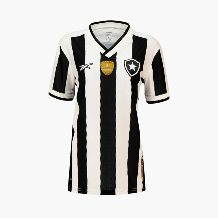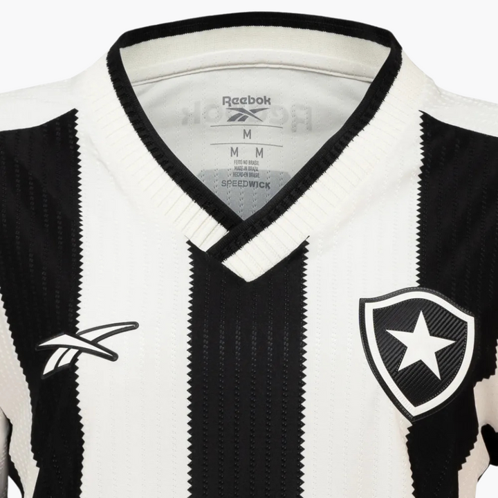 A camisa número 1 do Glorioso, agora em versão feminina. O novo manto da temporada 2024/25 combina tradição e modernidade, com faixas verticais em preto e branco, acabamento refinado e caimento pensado para o corpo feminino. A entrega um modelo com textura exclusiva, gola em V e o escudo monocromático bordado no peito — símbolo de identidade e respeito à história do Botafogo.
